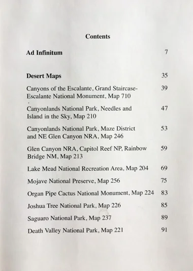 The second half of the book, Desert Maps, stems from a series of subjectively edited lists of historic place names of geological features found within the four North American deserts. The Great Basin, Mojave, Sonoran, and Chihuahuan deserts fall north to south from Nevada to Mexico and east to west from California to Colorado. The place names are culled from trail maps of national parks and other protected areas based on USGS topographical surveys. The texts record the naming of significant landmarks encountered by travelers to these desert regions, recording their awe and misgivings about these new territories; the lists are roughly arranged from the most positive and inspired to the most negative and terrified. The ten works in “Desert Maps” exist as hand-written drawings of black pen on gray Rives BFK paper and as site-specific cut-vinyl wall texts; they are also printed along with the script from Ad Infinitum as an artist book, Ad Infinitum and Desert Maps.