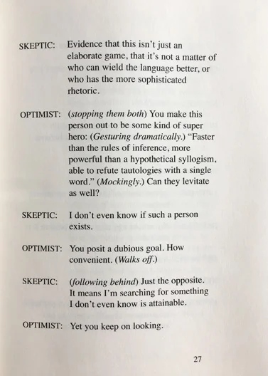 [2005] Conceived during an artist residency at Art in General, New York, NY, this artist book collects together two separate projects to both document and expand on the original pieces. Adapted from the transcript of a video, Ad Infinitum presents the Beckettian dialogue between an Optimist and a Skeptic as they make their way across a desert landscape. Each in turn uses logic to trap the other in contradictions, trying to convince the other of the correctness of their own position. The argument circles round and round, nobody winning, nobody capitulating.